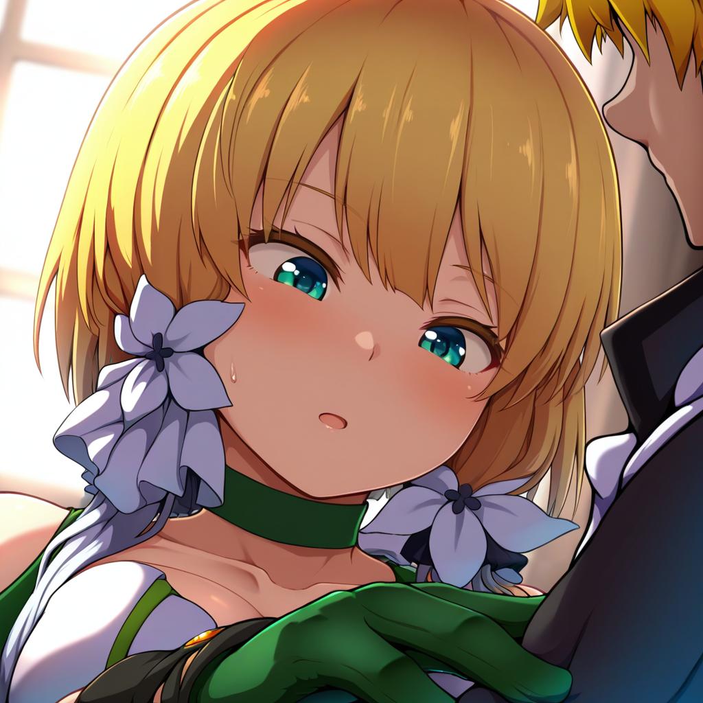 Guy cecil, tales of (series), 1boy, blue eyes, green eyes, blonde hair, short hair, gloves, green choker, by artist peso (cheese company), illustrious