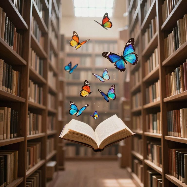 An ethereal library where stories take flight, their pages transforming into vibrant butterflies that dance through the air, symbolizing the boundless freedom and infinite possibilities found within the written word.