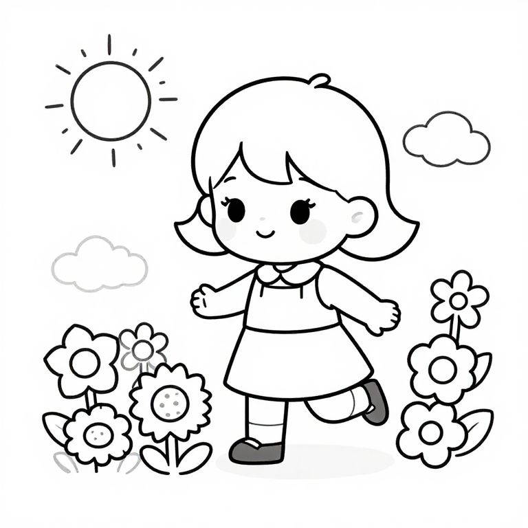 Expanded Consciousness black & white coloring page for kids cartoon style little girl playing amongst flowers,