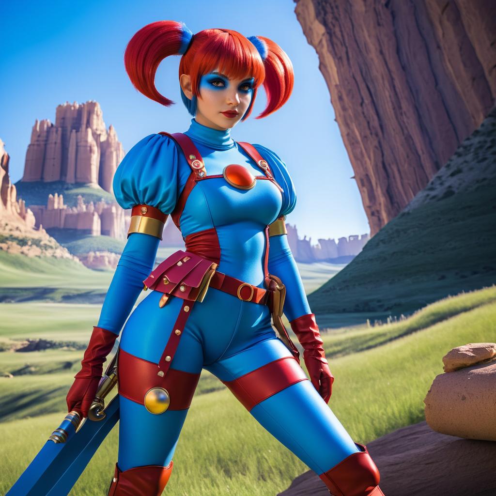 Digital artwork of a female character styled as Harley Quinn wearing a vibrant blue and red costume inspired by Nausicaä of the Valley of the Wind. She has bright red hair in twin ponytails with blue hair accessories, a blue mask, and red gloves. The background features a scenic valley with green grass, towering cliffs, and a partly cloudy sky.