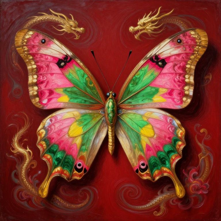 The image presents a breathtakingly intricate and vibrant painting of a majestic butterfly, with wings that are a symphony of colors including ruby pink, green, gold, and yellow. The butterfly's wings are adorned with elaborate patterns and textures, creating a sense of depth and complexity. The background is a rich, dark red, which contrasts beautifully with the butterfly's vibrant colors, making it the focal point of the composition. Surrounding the butterfly are swirling, fantastical elements that add to the magical and majestic atmosphere of the image. These elements include golden, dragon-like creatures and intricate floral designs, all rendered with a high level of detail that suggests a 8k, UHD resolution. The overall composition is balanced and harmonious, with the butterfly centrally positioned and the surrounding elements carefully arranged to complement its grandeur. The interplay of colors, textures, and shapes creates a visually stunning and immersive experience.