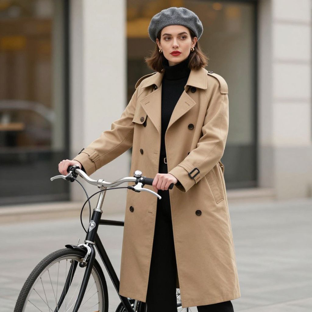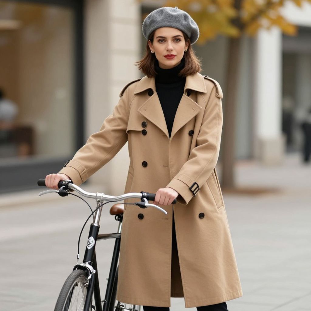 Stylishly dressed woman stands confidently with her bicycle, donning a camel trench coat, gray beret, and black turtleneck, embodying urban chic in a crisp fall setting.