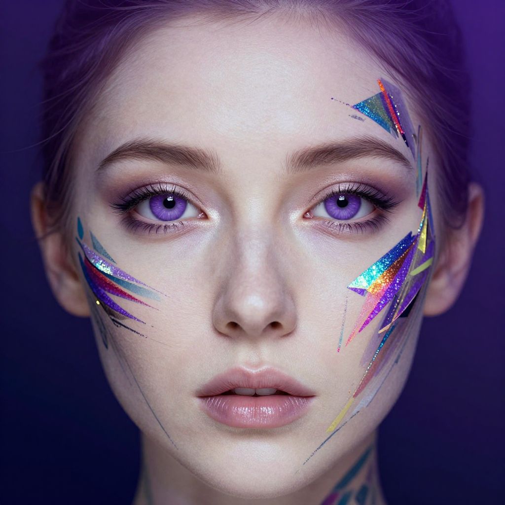 This is a digital portrait of a young woman with pale skin and striking purple eyes. Her face is adorned with vibrant, geometric, rainbow-colored face paint on her cheeks and temples, creating a futuristic, artistic effect. She has dark brown hair pulled back, with subtle makeup emphasizing her eyes and lips. The background is a gradient of dark blue to purple, enhancing the vivid colors on her face. The image has a hyper-realistic style, with sharp details and a slightly glossy finish, emphasizing the texture of her skin and the shimmer of the face paint.