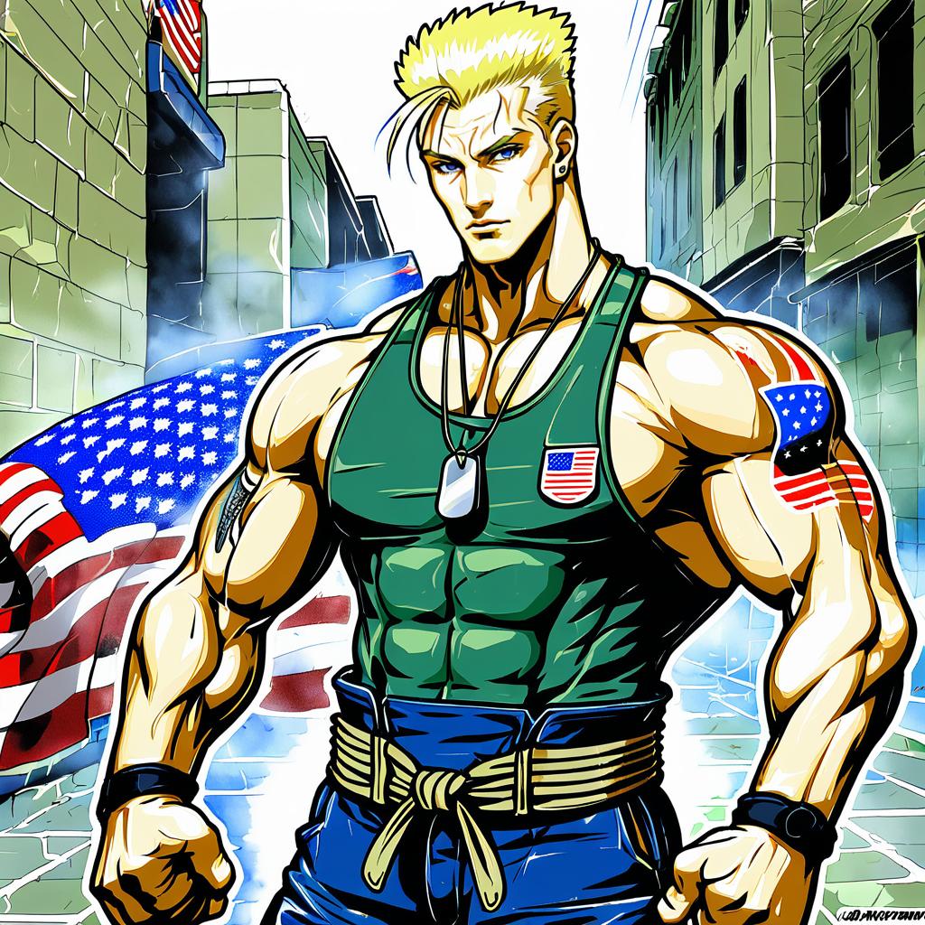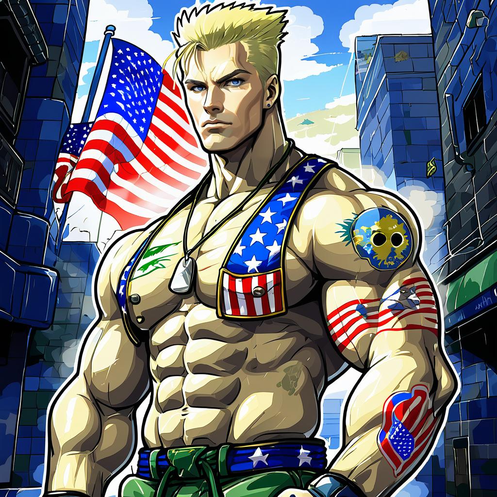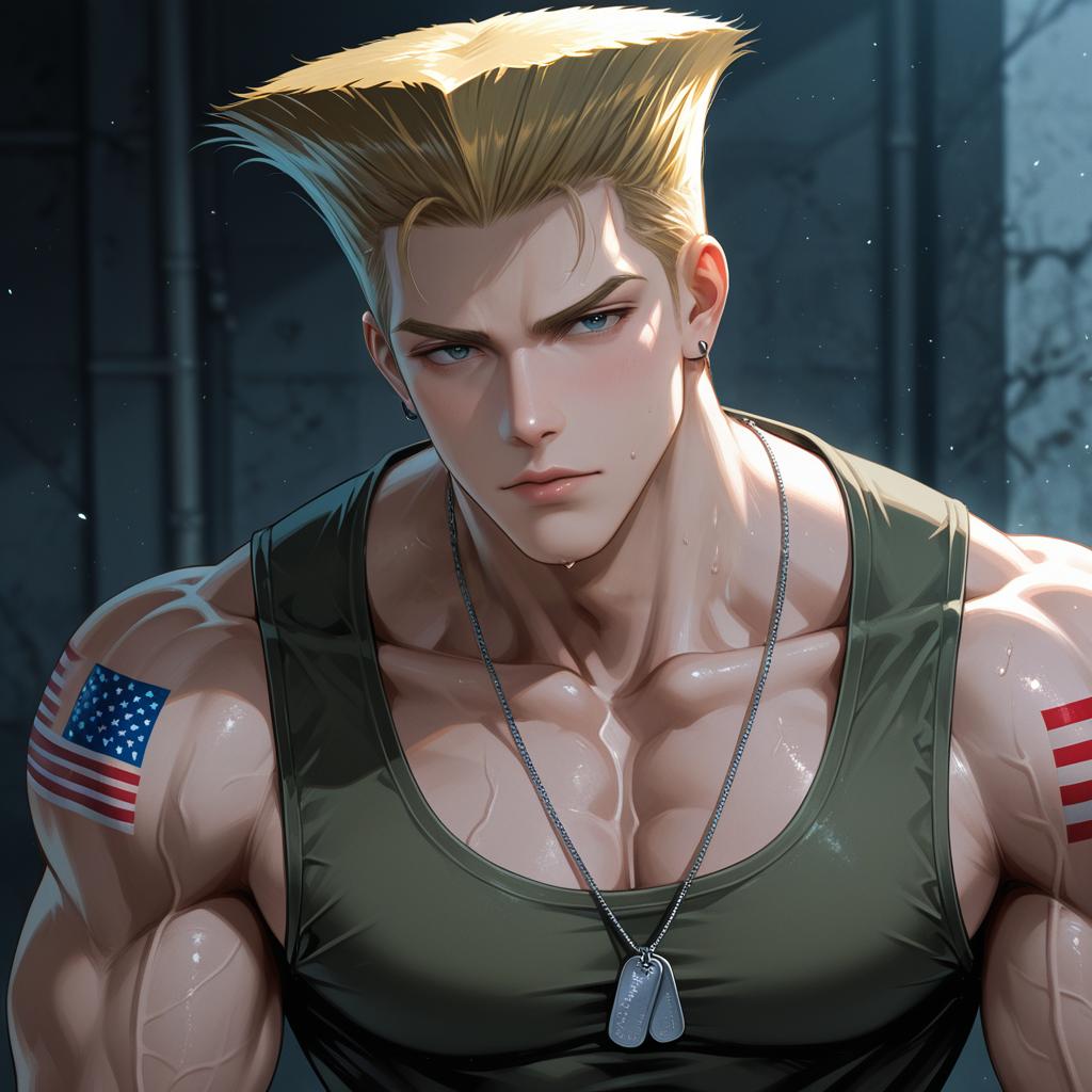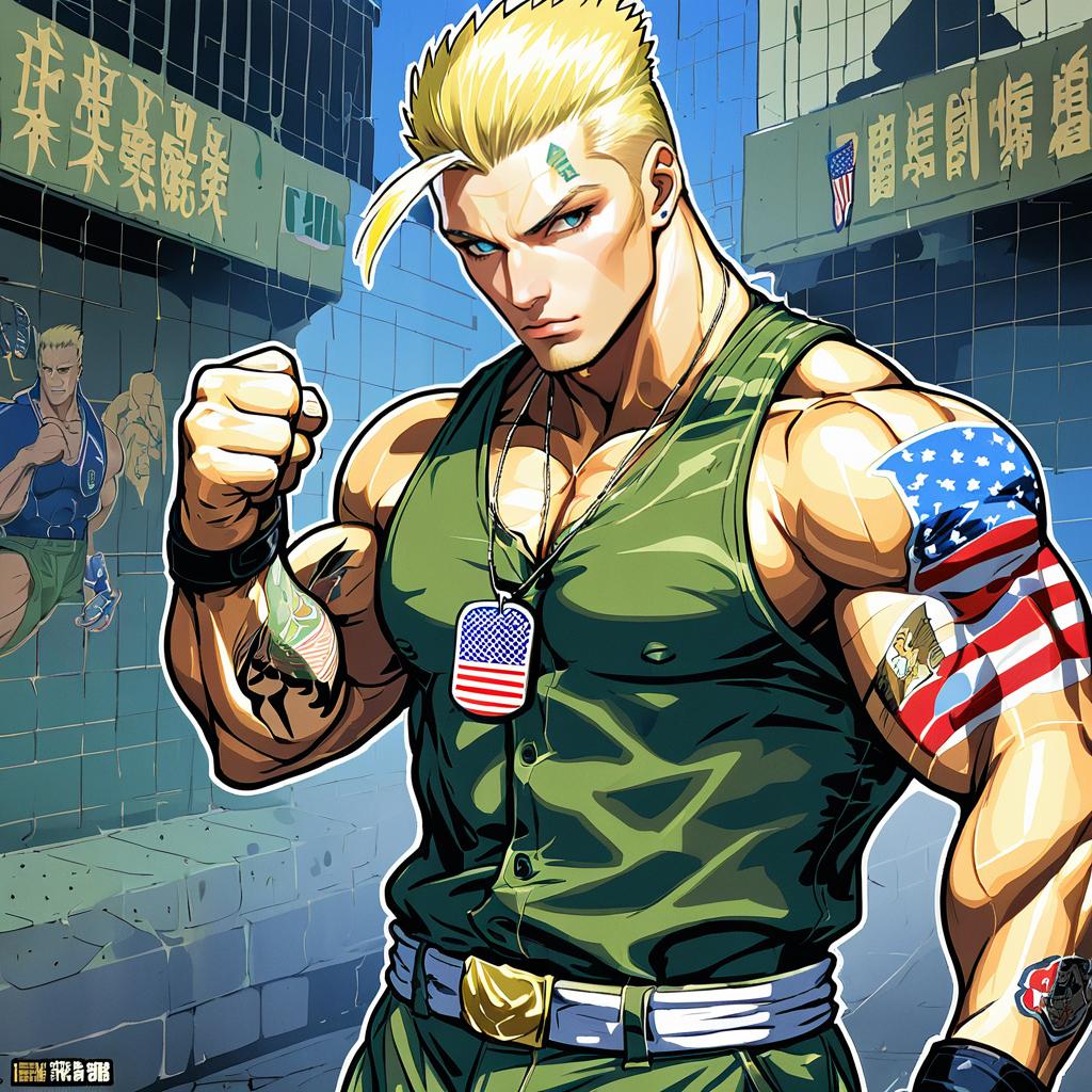 Guile, street fighter, 1boy, blue eyes, blonde hair, short hair, american flag tattoo, tattoo, muscular male, flattop, dog tags, by artist hitoto, dark_illustrious