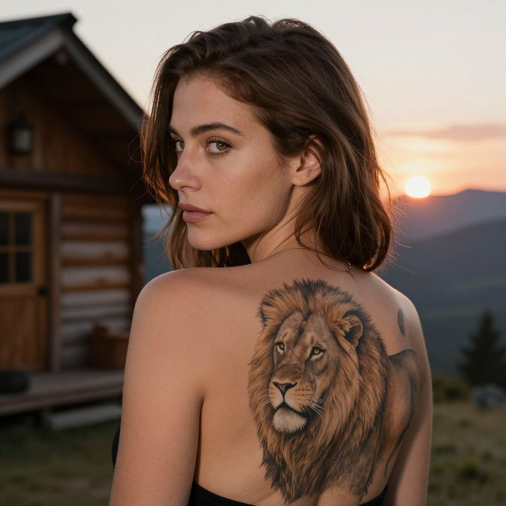 A realistic portrait of a woman with soft brown hair, warm hazel eyes, and a calm expression, having a large lion tattoo on her back, the lion fully depicted with realistic fur texture, set in a quiet mountain cabin with a sunset behind her, natural lighting creating warmth and depth.