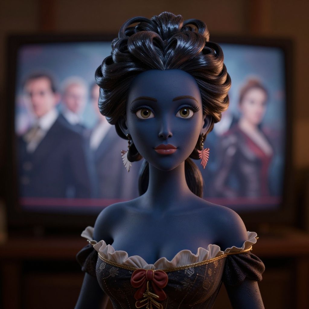 A highly detailed CGI image of a blue-skinned doll with large, expressive eyes and dark, intricately styled hair, wearing an off-the-shoulder, Victorian-inspired dress with a pink bow. She has delicate, dangling earrings. The background features a blurred, out-of-focus television screen showing four people in formal attire. The lighting is warm, highlighting the doll's face and dress, while the TV screen provides a soft, blue glow. The image combines realism with a slightly fantastical, doll-like aesthetic.