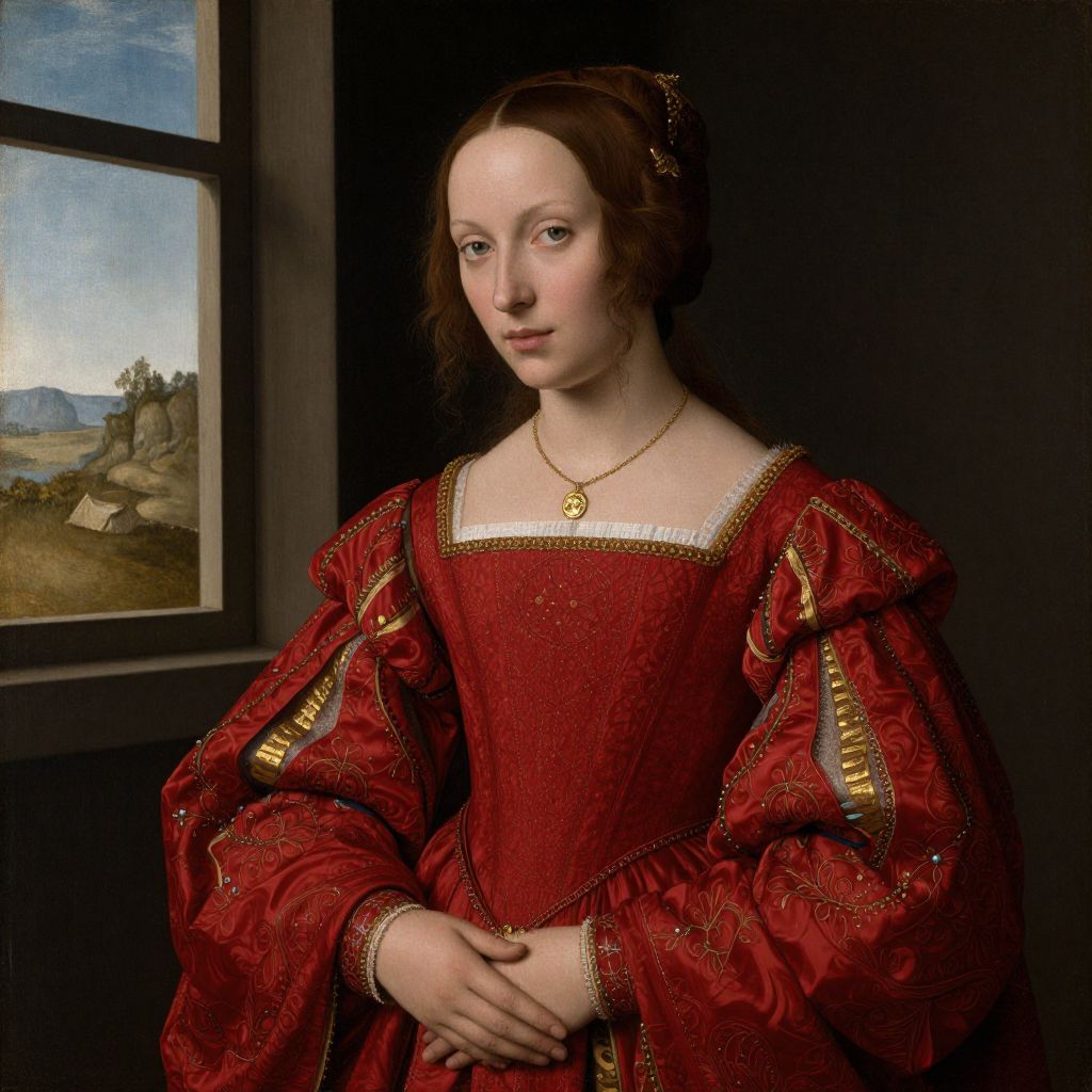 Renaissance portrait of a pale-skinned woman with brown hair, wearing an ornate, red, embroidered dress, standing by a window with a