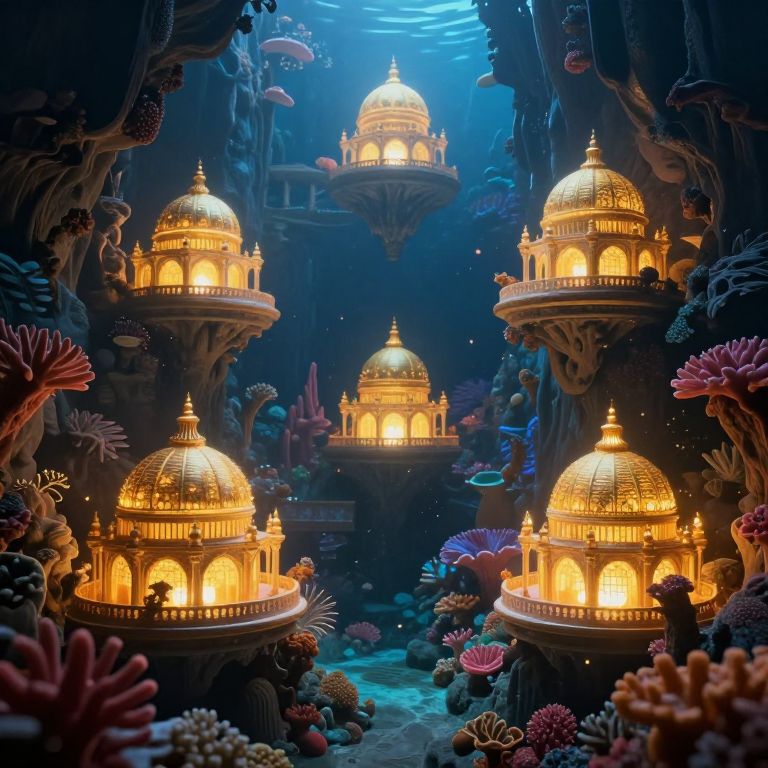 Underwater caverns cradle six luminous domes, each housing golden palaces that glow warmly amidst vibrant coral formations and floating particles, creating a surreal aquatic wonderland.