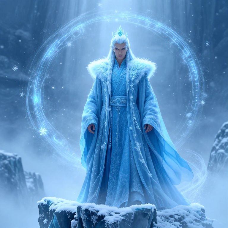 Icenraat, a mystical ice sorcerer cloaked in frosty blue robes, standing on a frozen cliff with swirling snowflakes and glowing runes, intense gaze piercing through the cold mist, highly detailed fantasy character portrait.