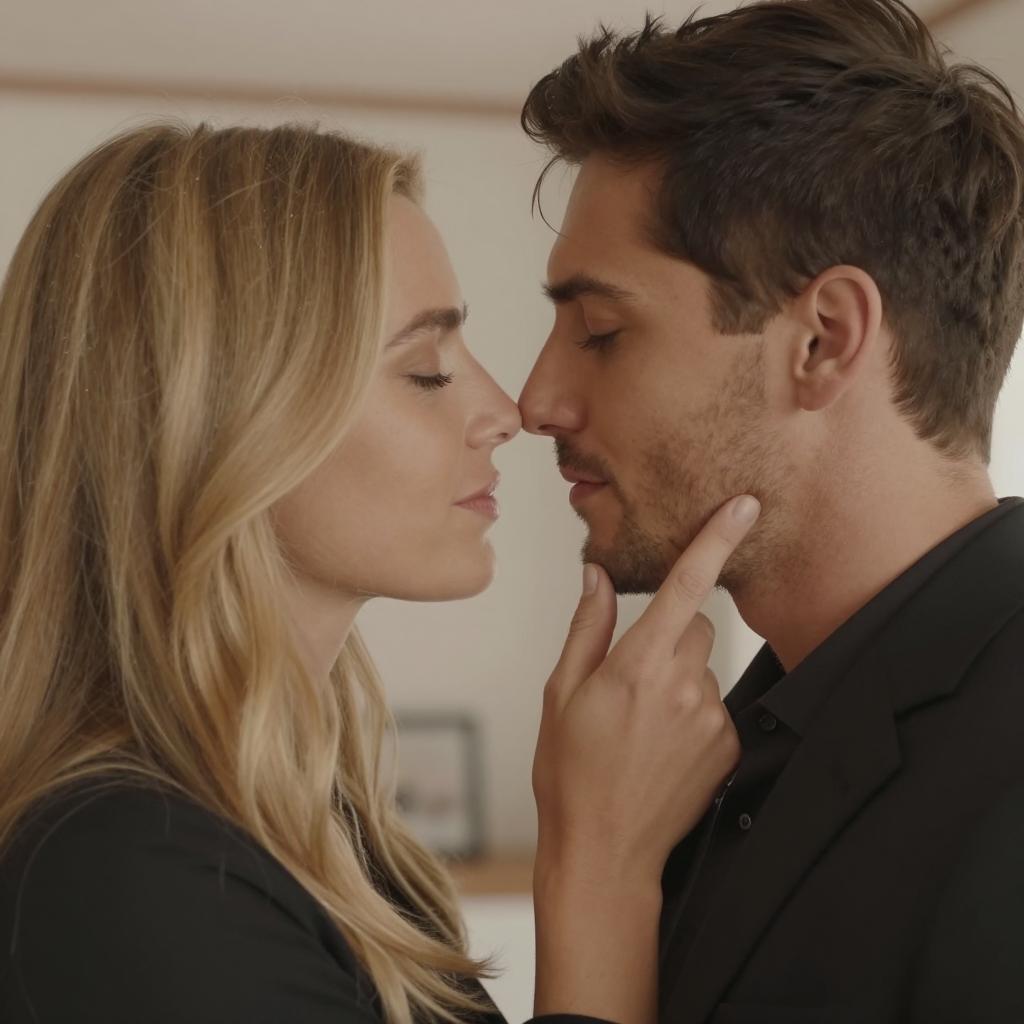 A man and woman in an intimate moment. Man with short dark hair, wearing a black leather jacket, kisses woman's forehead. Woman with blonde hair, wearing a maroon velvet long-sleeve shirt, looks up with wide eyes. Woman's right hand touches man's chin, wearing a gold ring. Man's face partially obscured by woman's hand. Dark background. Two people.