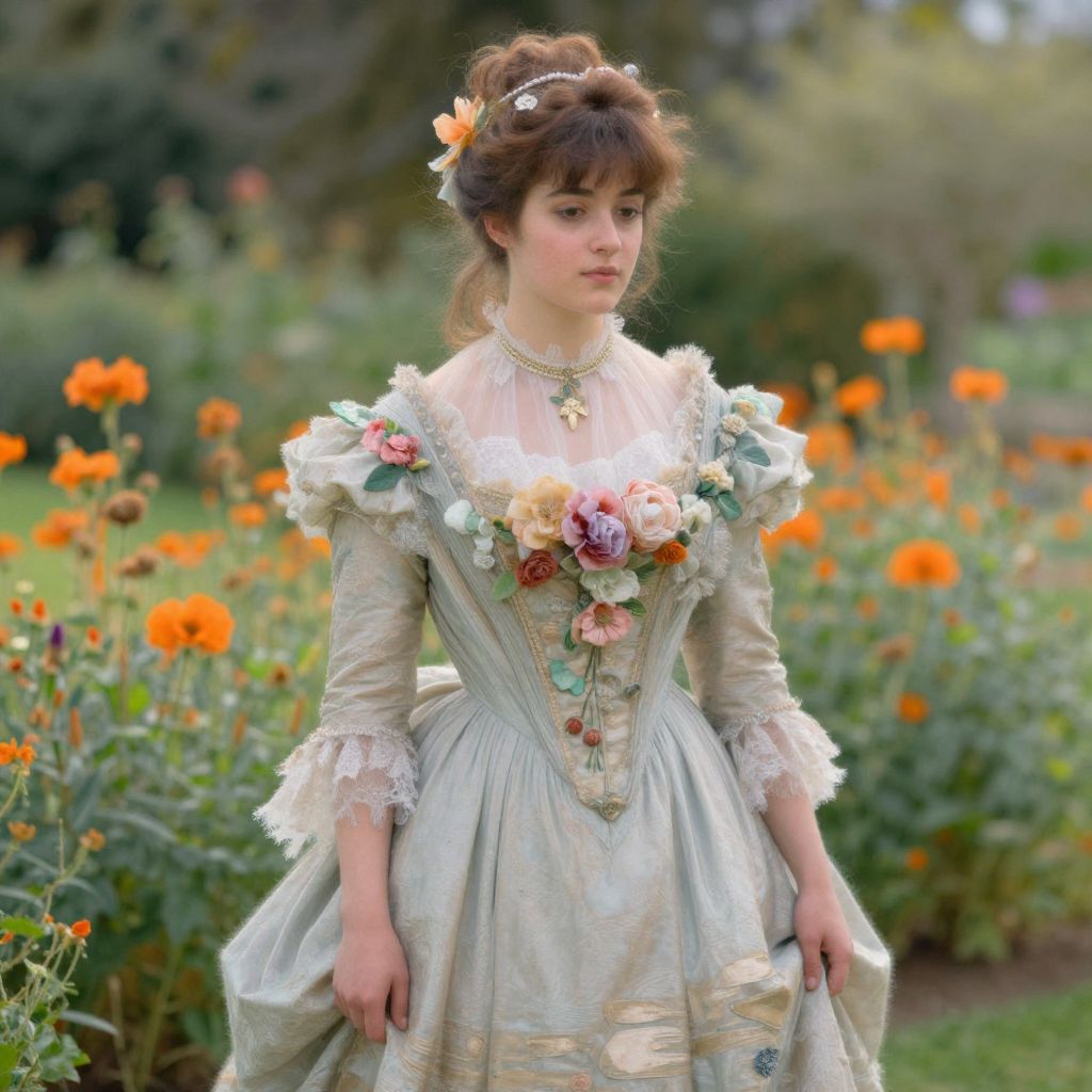 Photograph of a fair-skinned woman in a Victorian-style, cream-colored dress adorned with floral embellishments, standing in a vibrant garden filled with orange