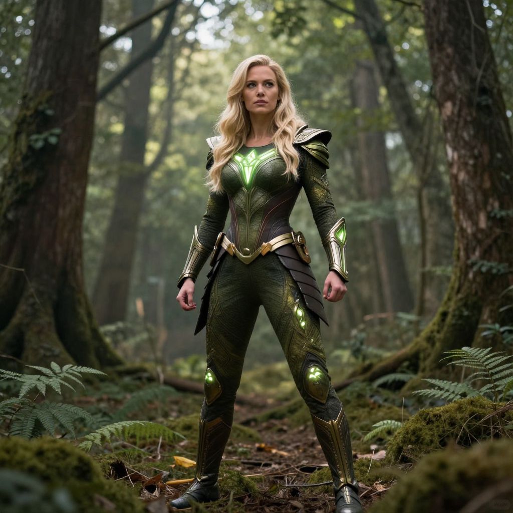 In this captivating concept art, two superheroes stand side by side, their green and gold costumes blending futuristic and sci-fi aesthetics. The male superhero, positioned to the left, dons a green suit with intricate gold accents, a matching green mask, and a belt with a gold buckle. His muscular build and confident stance exude strength and readiness. To his right, the female superhero showcases a striking gold suit with green accents, adorned with a large gold star emblem on her chest and a gold headpiece. Her flowing blonde hair adds a touch of elegance to her powerful appearance. The background is a dark, smoky green, enhancing the dramatic and otherworldly atmosphere of the scene. The overall composition is balanced, with the two characters evenly spaced, creating a harmonious visual dynamic.