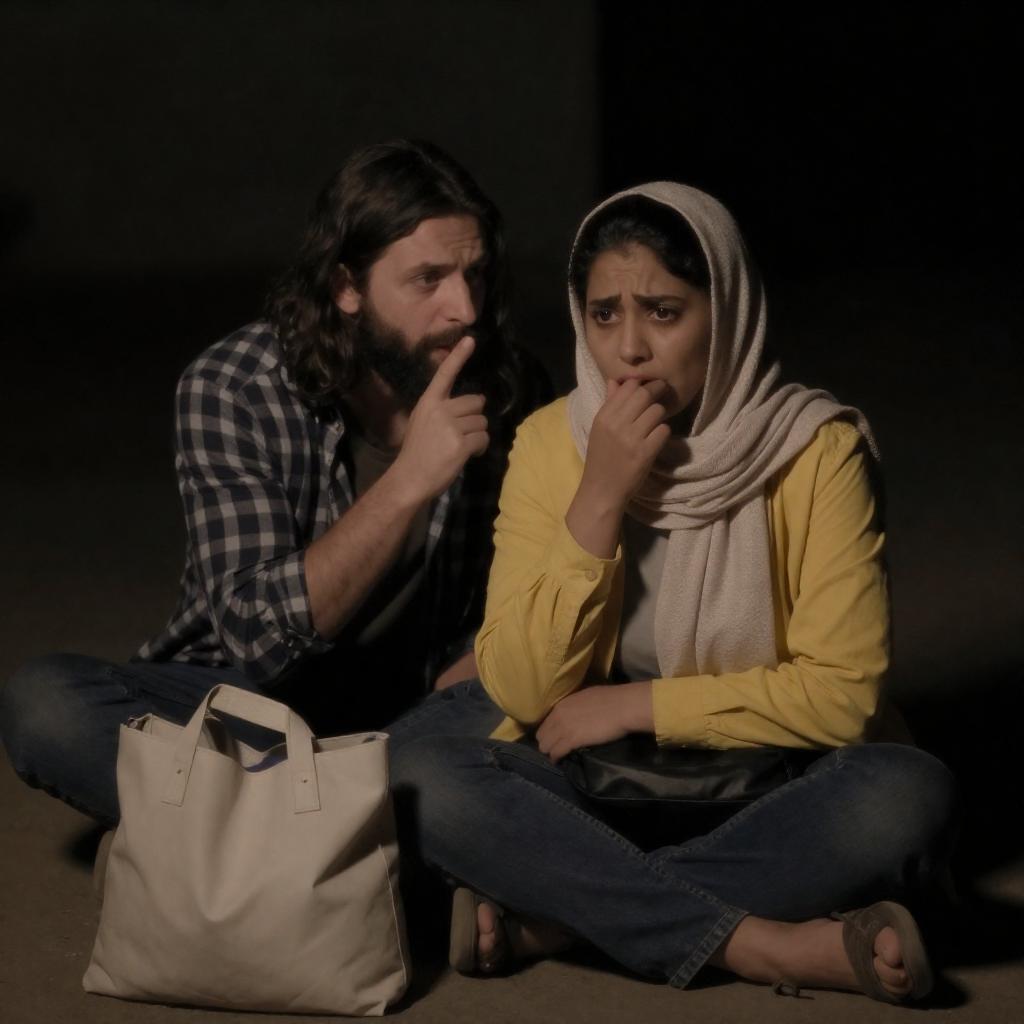 Photograph of a dark, dimly lit scene. A bearded man with long hair and a checkered shirt leans close to a woman with a headscarf, yellow jacket, and worried expression. Man's finger is raised to his lips. Both on the ground, surrounded by bags and dim light. Woman's right hand covers her mouth. Background is dark and shadowy.