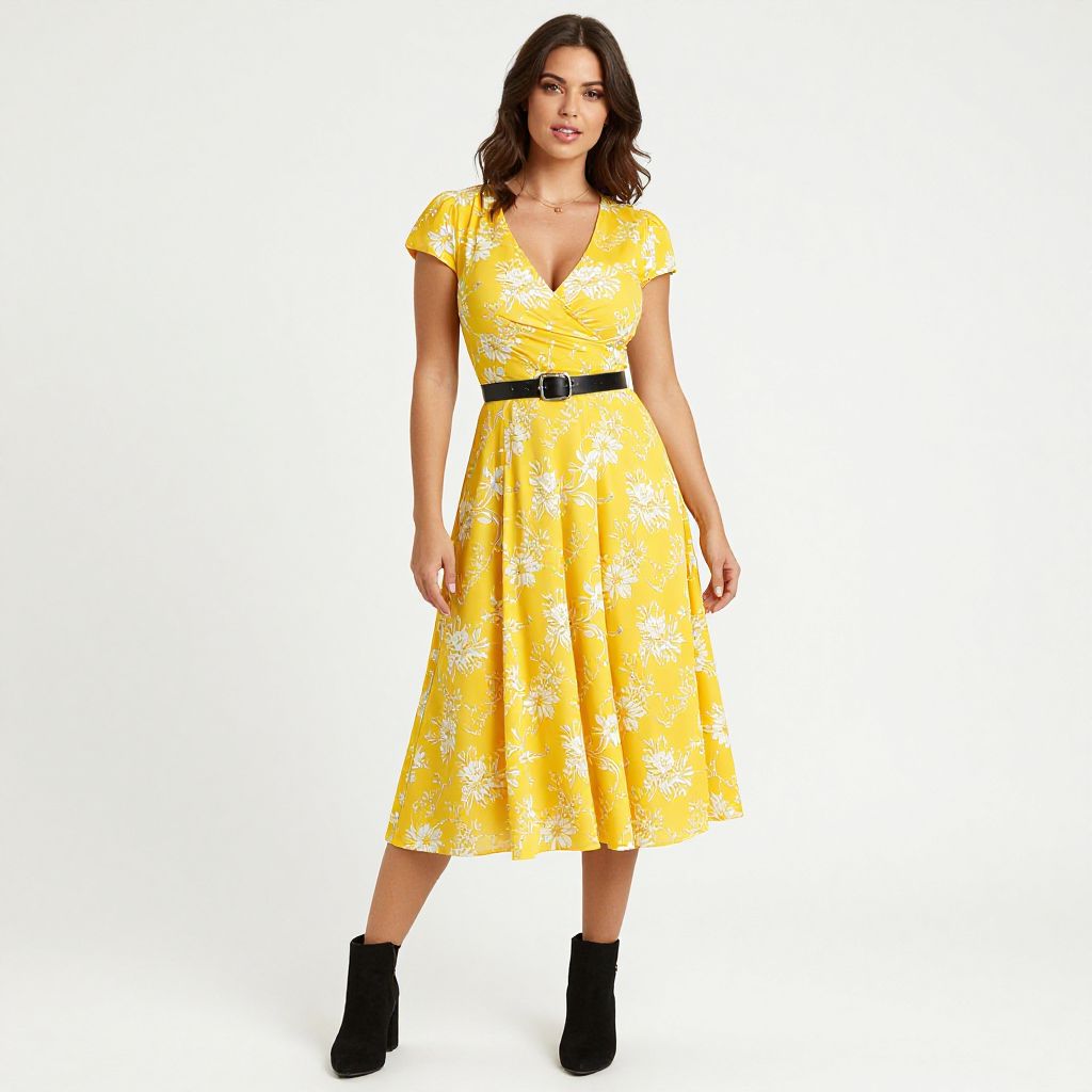 Photograph of a curvy woman with medium skin tone and long, wavy dark brown hair. She wears a yellow, short-sleeved, V-neck dress adorned with white floral patterns, cinched at the waist with a black belt. The dress falls to mid-calf length. She pairs the dress with black ankle boots. Her makeup is subtle, with red lipstick. She stands against a plain white background, facing forward with a neutral expression. The image has a bright, clean, and studio-like quality, highlighting the vibrant yellow of her dress.