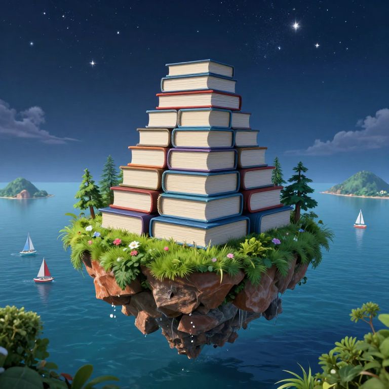 Fantastical CGI image of a floating island covered in grass and books, stacked in a pyramid shape, surrounded by a starry night sky, calm