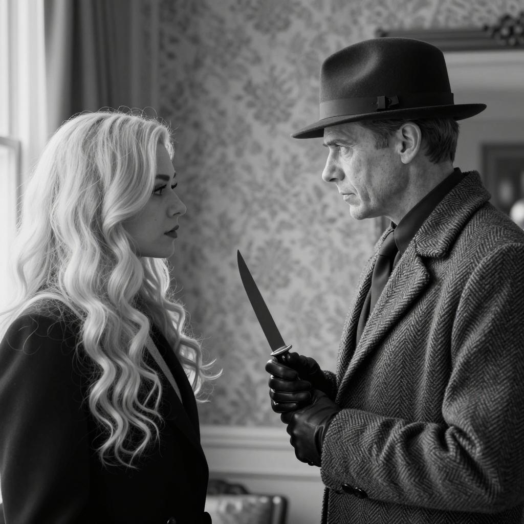 Black-and-white photograph of a man and woman indoors. The man has dark slicked-back hair, black glasses, and wears a wool jacket while holding a cardboard box. He leans toward the woman with an intense expression. The woman has wavy dark hair, wears a black hat and a light-colored coat with a dark bow, looking up at the man with a focused gaze. The background features draped curtains and a window.