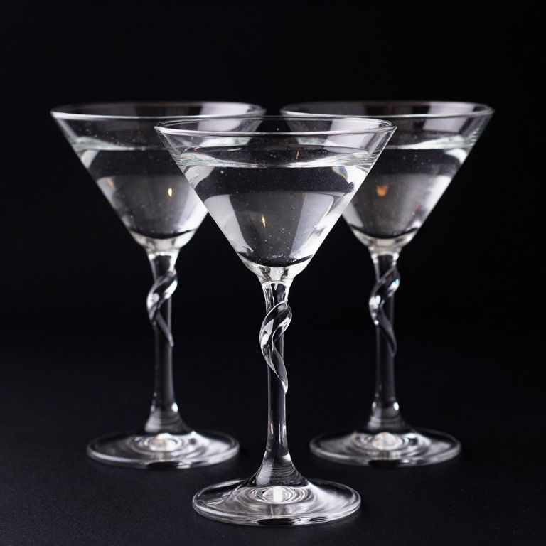 Photograph of three martini glasses filled with clear liquid, each with a twisted, spiral-shaped stem. The glasses are arranged in a staggered line against a black background, with colorful light reflections highlighting their clear, smooth surfaces. The front glass is closest, slightly larger than the two in the background. The overall style is sleek and modern.