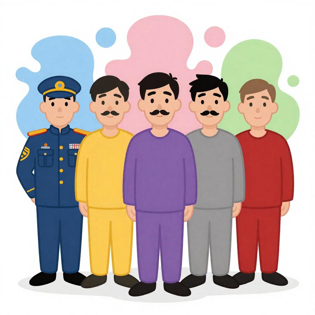 Cartoon drawing of five men in colorful clothes, standing in front of whimsical, abstract shapes. Men have black hair and mustaches, wearing yellow, purple, gray, and red outfits. One man raises his hand. Background includes blue, pink, and green shapes. One man in blue military uniform stands left.