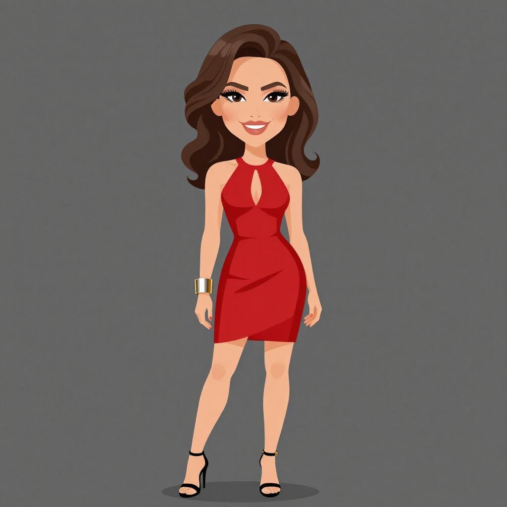 Woman with pretty face and pretty hair. smiling Woman, chic, sleeveless red mini dress, halter neckline with a keyhole cutout, form-fitting silhouette, asymmetrical hemline, black strappy heeled sandals, large metallic cuff bracelet on one wrist. --sref 1467