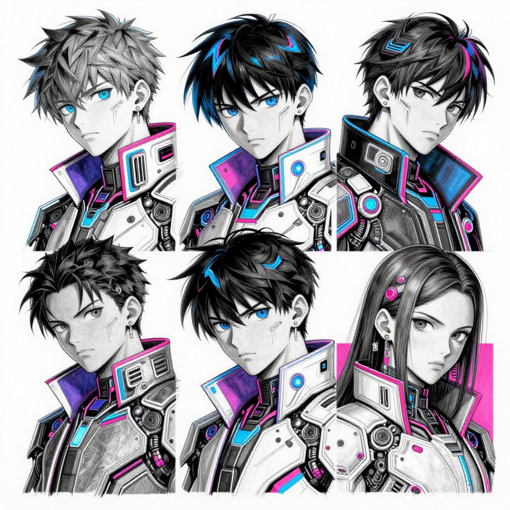 Sketches of anime characters with futuristic cyberpunk themes, sharp angular lines, neon highlights in blue and pink hues, intricate mechanical details on costumes, expressive faces with bold eyes, grayscale with selective color pops, high detail hand-drawn illustration style.