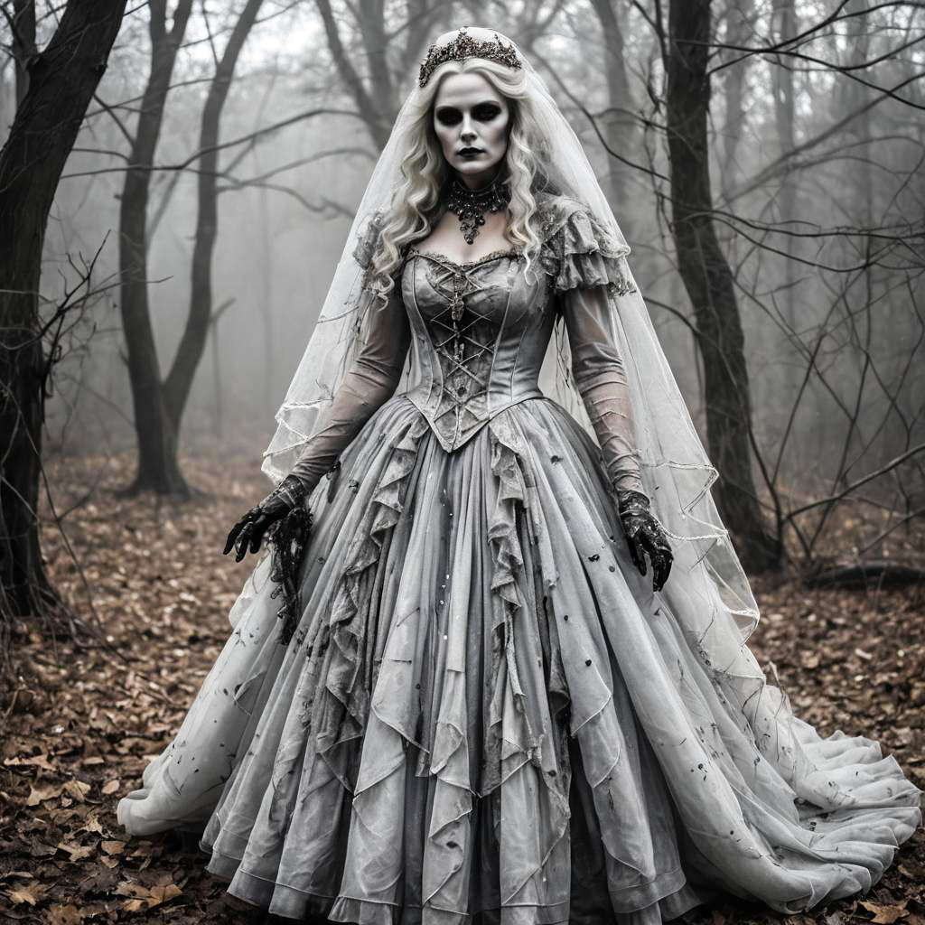 Halloween outfit, worn by mysterious ghost, featuring tattered ethereal gown with hoop skirts, in pale grays and silvers.