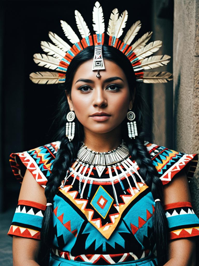 Woman in Aztec Princess Dress costume, cosplay editorial portrait, cinematic realism