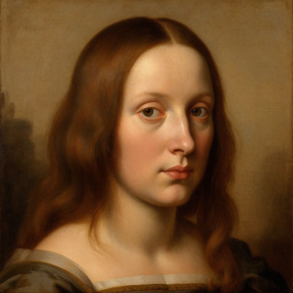This is a digital reproduction of a classical oil painting depicting a young woman with fair skin and light brown, wavy hair that falls to her shoulders. She has large, expressive brown eyes, a straight nose, and slightly parted lips. She is wearing a dark, off-the-shoulder garment with a light-colored, square neckline. The background is a muted brown, allowing the subject to stand out. The painting has a realistic style with smooth, delicate brushstrokes and a soft, natural light highlighting her face. The texture of the paint is slightly visible, adding a tactile quality to the image.
