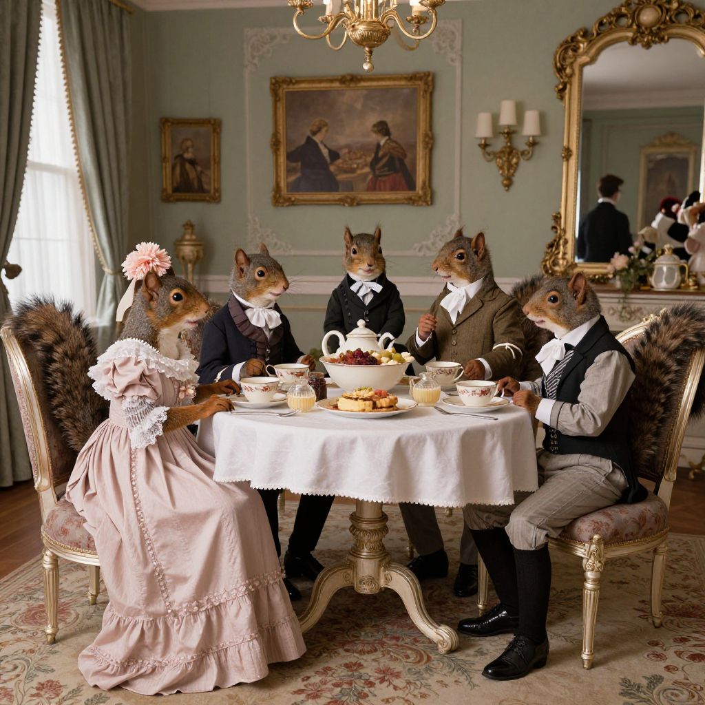 Victorian animals in clothes, a group of squirrels dressed in fine 19th-century attire, including petticoats and waistcoats, gathered around a tea table in a lavishly decorated Victorian parlor, soft lighting, elegant and refined atmosphere.