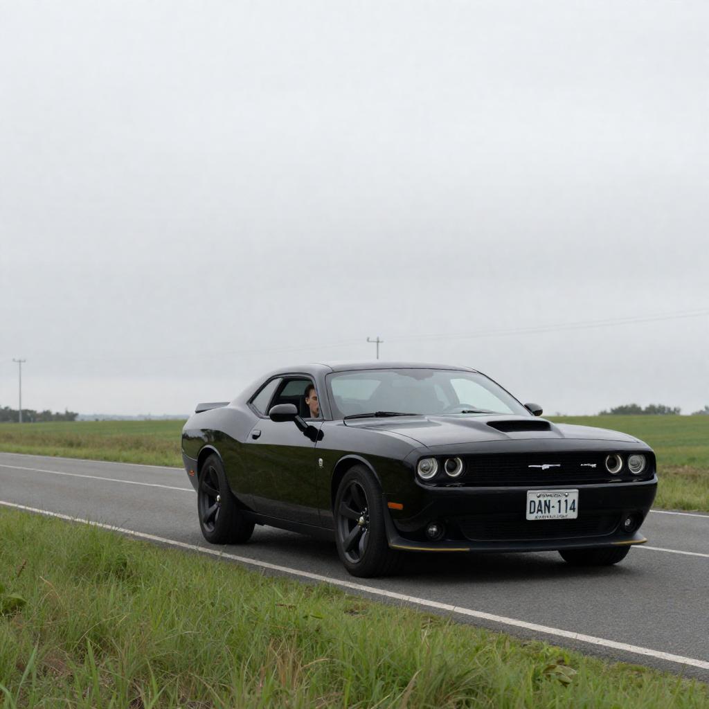 Photograph of a man in a black jacket and cap, standing beside a shiny red and black classic muscle car with black racing stripes and round headlights. He rests his hand on the car's roof. The car is parked on a gravel path with a green, wooded background.