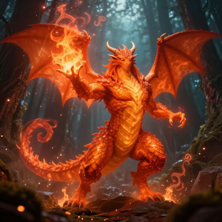 Digital fantasy artwork of a fierce, red-orange dragon standing in a dark, misty forest. The dragon's scales glow with fiery light, its large wings outstretched, and it holds a flaming hand. Its muscular body is covered in sharp, jagged scales, with a long, curled tail also engulfed in flames. The forest background is dimly lit, with tall trees and a mystical blue light filtering through the canopy. The dragon's eyes glow intensely, and it has prominent horns and a fierce expression. The ground is scattered with rocks, adding texture to the scene.