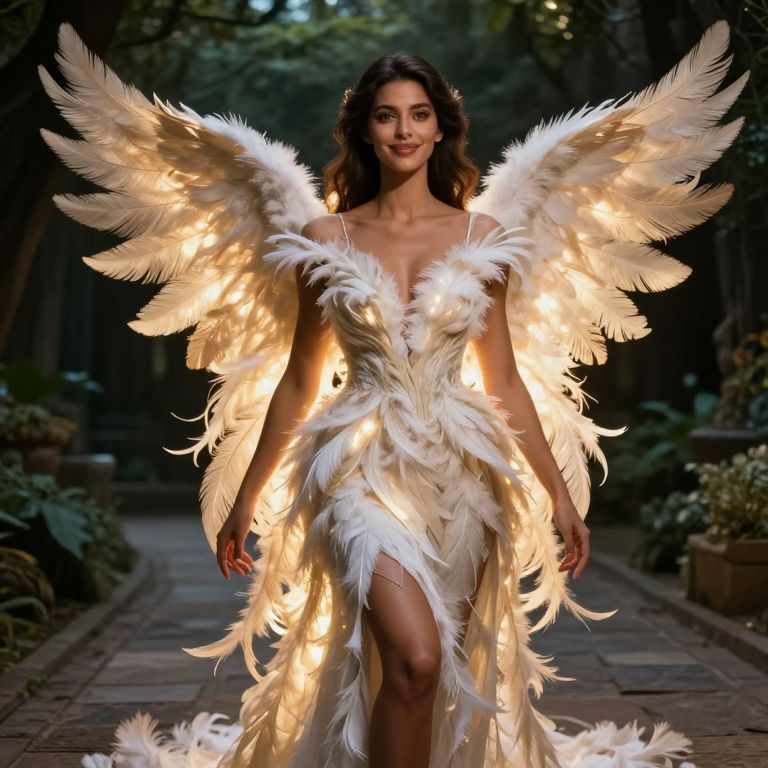 A voluptuous feather goddess with smooth olive skin, expressive brown eyes, and a warm, regal smile stands in a celestial garden, her body wrapped in luxurious, flowing feathers that form an extravagant plume ensemble, each feather emitting a radiant glow, casting soft light on the stone pathway beneath her, dramatic chiaroscuro lighting, realistic and cinematic