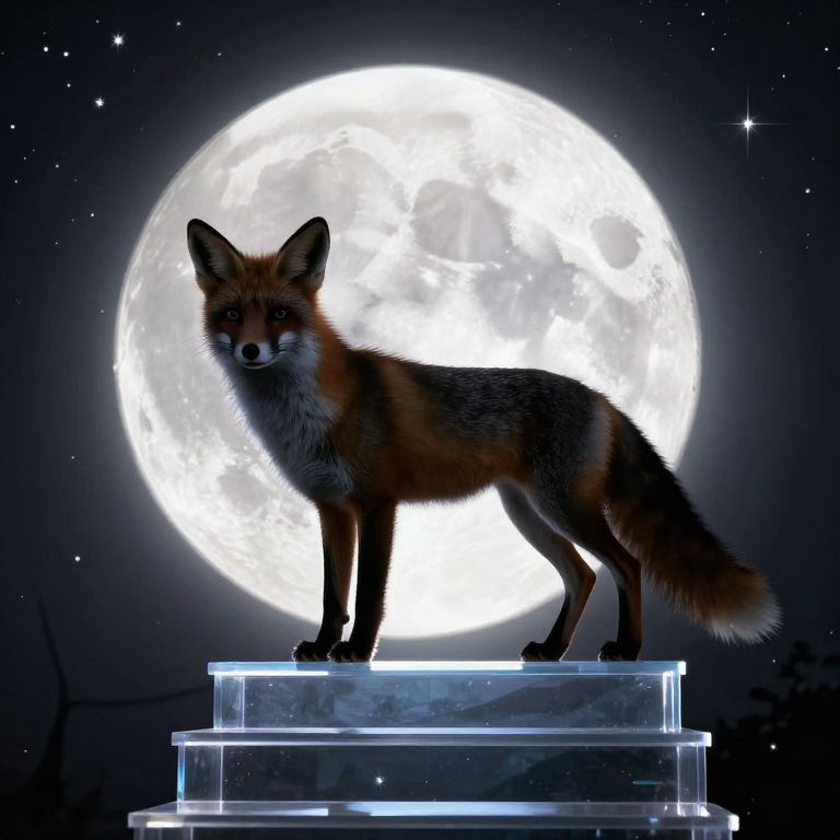 Fox stands gracefully atop a transparent staircase, its silhouette illuminated against a luminous full moon backdrop dotted with twinkling stars.