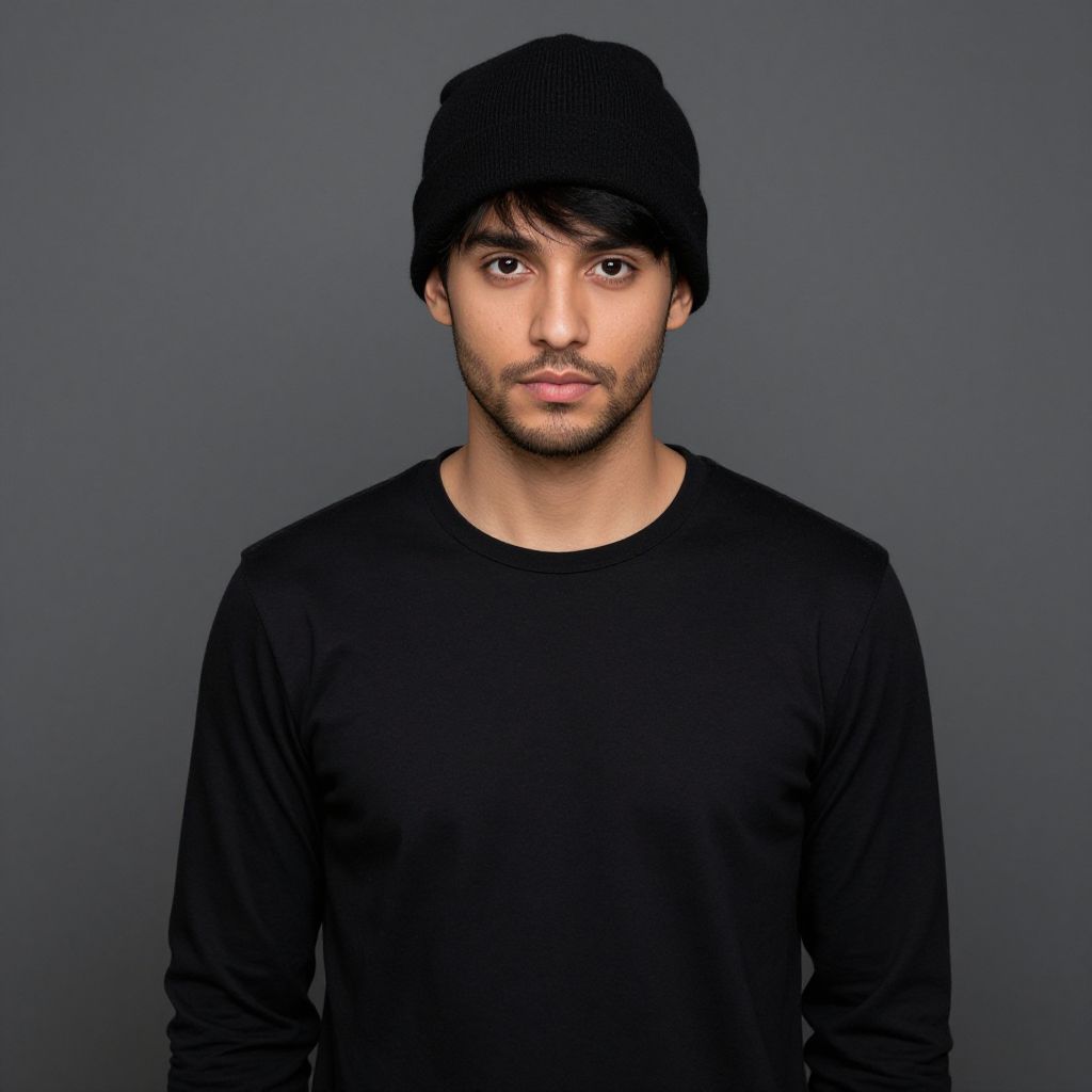 "amun costume, solo, 1boy, male focus, standing, looking at viewer, black hair, arms at sides, hat, long sleeves, facial hair, black eyes, closed mouth Realistic photo of casual sexy person with pretty face"