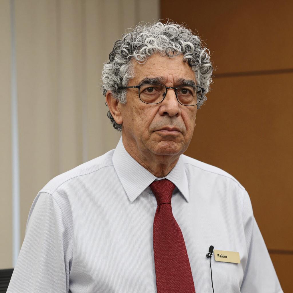 Middle-aged man with curly gray hair and glasses, wearing a striped white shirt and red tie, standing indoors. Background includes vertical blinds and a wooden wall. He has a serious expression. Small name tag on his shirt. Upper body focus.