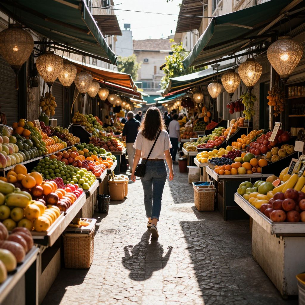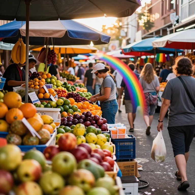 Vibrant fruit market display showcasing rows of colorful produce, including oranges, apples, grapes, and peaches, arranged neatly in wooden crates under warm pendant lights, with a man walking past in the background.