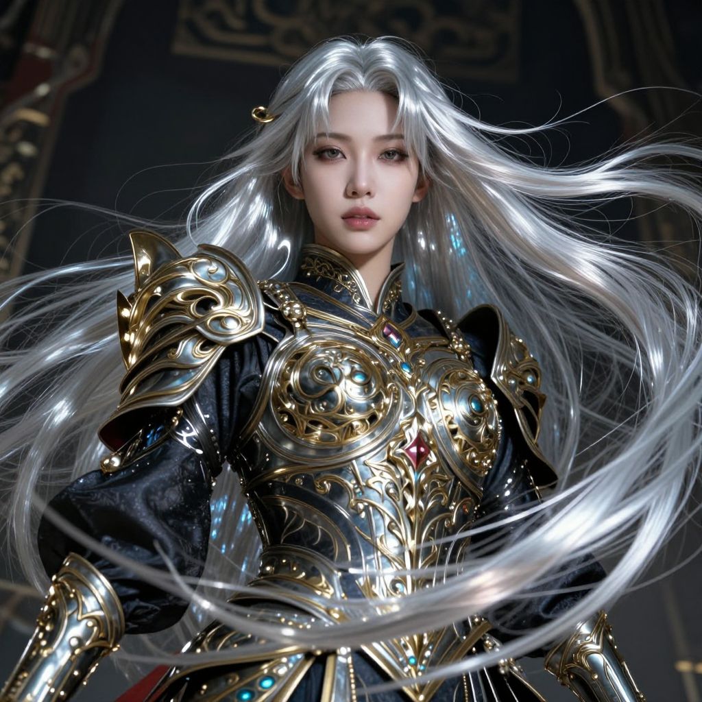Digital artwork of an ethereal, beautiful Asian woman with long, flowing silver hair. She wears ornate, gold and black armor with intricate designs, covering her shoulders and chest. Her expression is calm and confident. The background is dark and blurred, emphasizing her presence. Her skin is fair, and her eyes are almond-shaped with a subtle, knowing gaze. The armor has a glossy, reflective texture, contrasting with the silky appearance of her hair. The image has a fantasy, high-fantasy style, with a focus on detailed, elegant armor and a dramatic, otherworldly atmosphere.