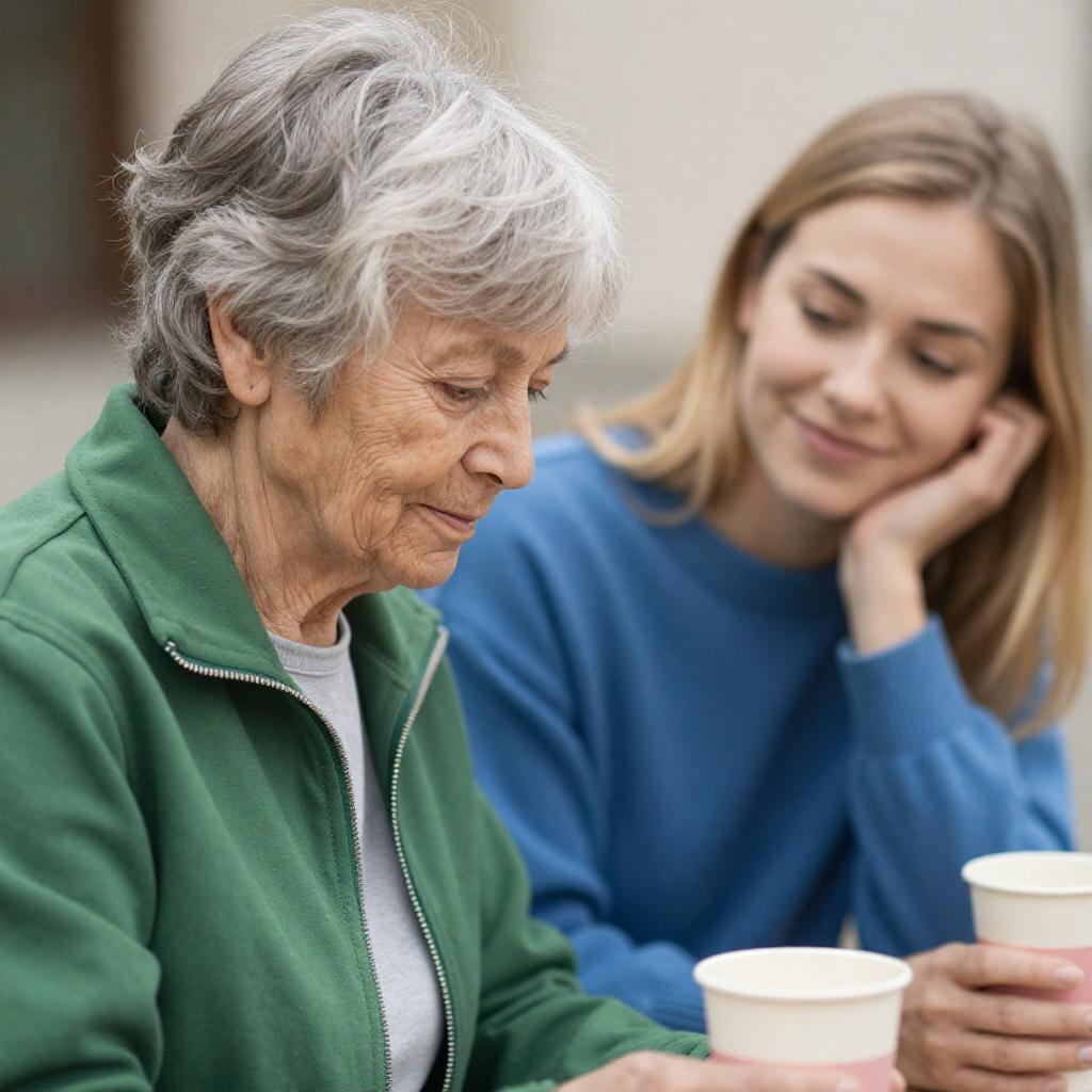 Photograph of an elderly woman with short gray hair and a green jacket, looking down, next to a younger woman with blonde hair and a blue sweater, smiling while resting her head on her hand. Both have soft, natural expressions. Background is blurred. Younger woman holds a pink and white cup. Outdoor setting.