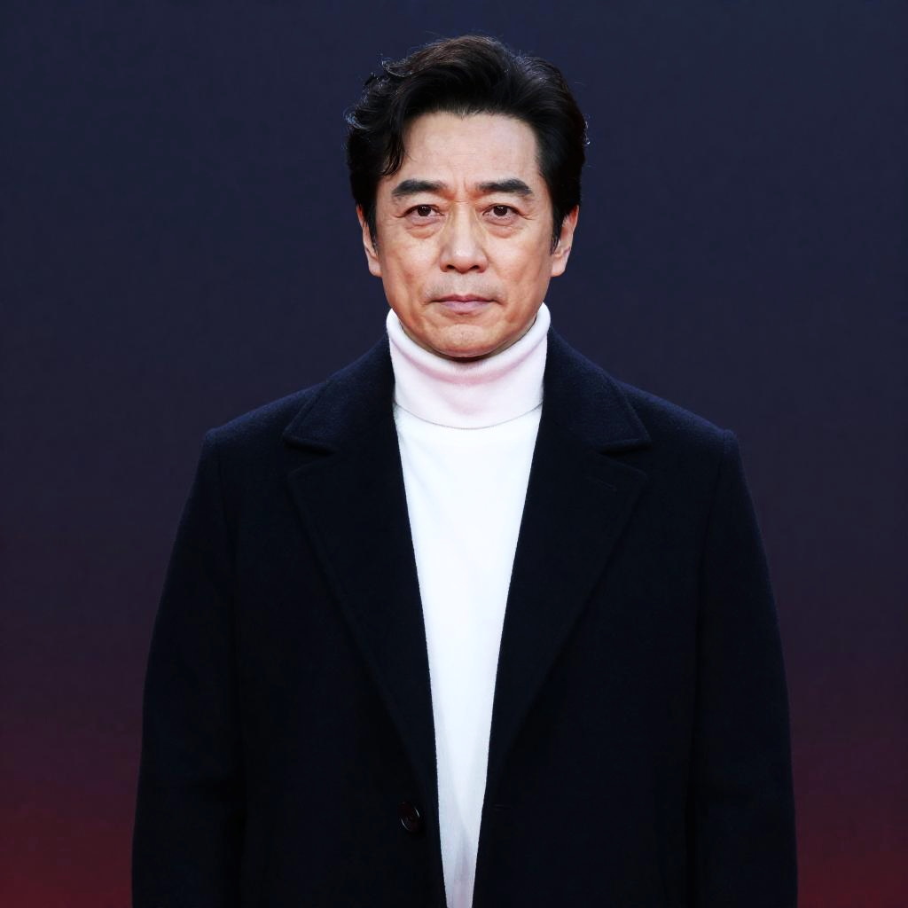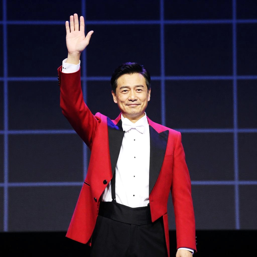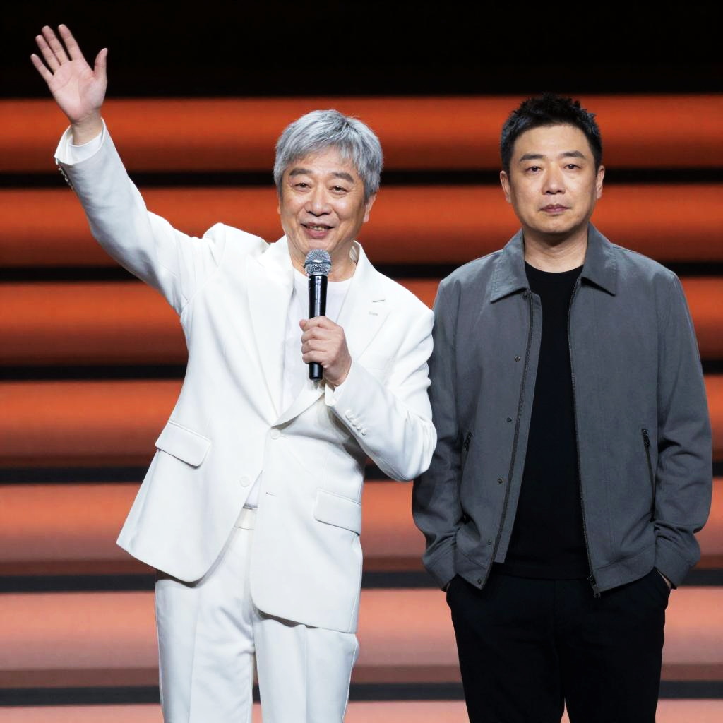 Photograph of two men on stage. Man on left, white suit, grey hair, smiling, raising right arm, holding microphone. Man on right, grey jacket, dark hair, hands in pockets, neutral expression. Background: orange steps with black edges.