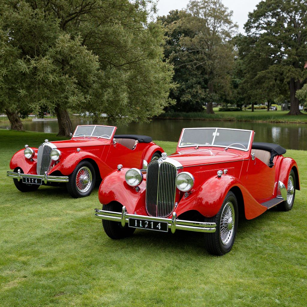 Photograph of two bright red vintage convertible cars with chrome grilles and black roofs, parked on lush green grass near a serene lake with large trees in