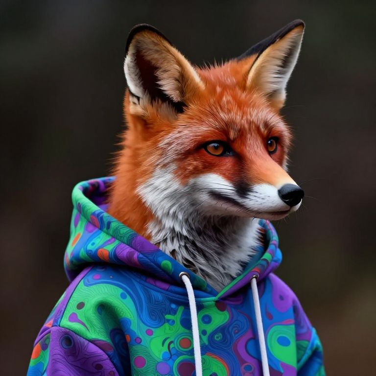 The image presents a striking portrait of a fox, depicted in a highly stylized and artistic manner. The fox is wearing a hoodie, which is adorned with a vibrant, colorful design that appears to be a mix of abstract shapes and patterns, predominantly in shades of blue, green, and purple. The hoodie is wrapped snugly around the fox's neck, creating a sense of pseudo-anonymity. The fox's fur is rendered with meticulous detail, showcasing a rich blend of orange, brown, and white hues, giving it a lifelike and textured appearance. The background is dark, which contrasts sharply with the colorful hoodie and highlights the fox's features. The overall composition is dynamic, with the fox's profile slightly turned, adding a sense of depth and intrigue to the image. The use of trippy, colorful elements and the pseudo-anonymous aspect of the hoodie create a sense of mystery and artistic flair.
