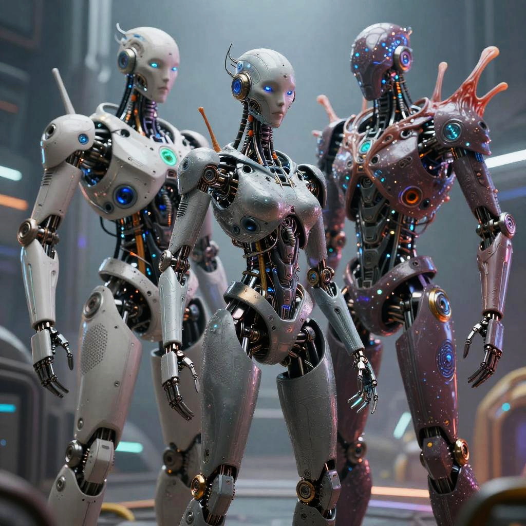 Photorealistic CGI image of three humanoid robots standing in a futuristic, dimly-lit industrial setting. The robots have sleek, metallic bodies with varied colors: white, silver, and dark metallic. Each has glowing blue and red eyes, intricate mechanical joints, and advanced arm and leg designs. Their chests are slightly rounded, resembling human-like breasts. The white robot is on the left, the silver in the center, and the dark metallic on the right. The background features blurred, colorful lights and metallic structures, adding to the sci-fi ambiance. The robots' skin-like textures and reflective surfaces create a lifelike yet futuristic appearance.