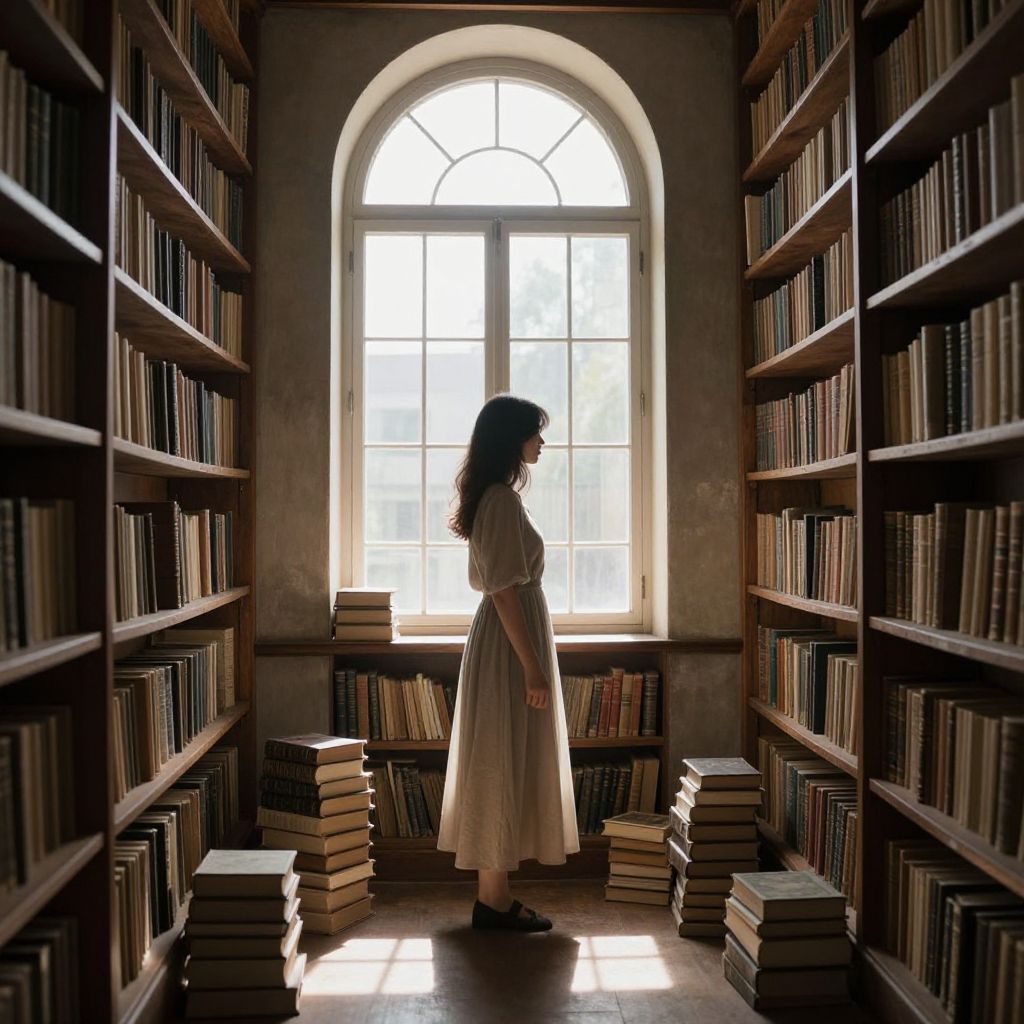 Sunlight streams through an arched window, illuminating a serene library where a woman in a flowing dress stands amidst scattered books, her silhouette framed by towering shelves filled with ancient tomes, casting a tranquil yet enigmatic atmosphere.