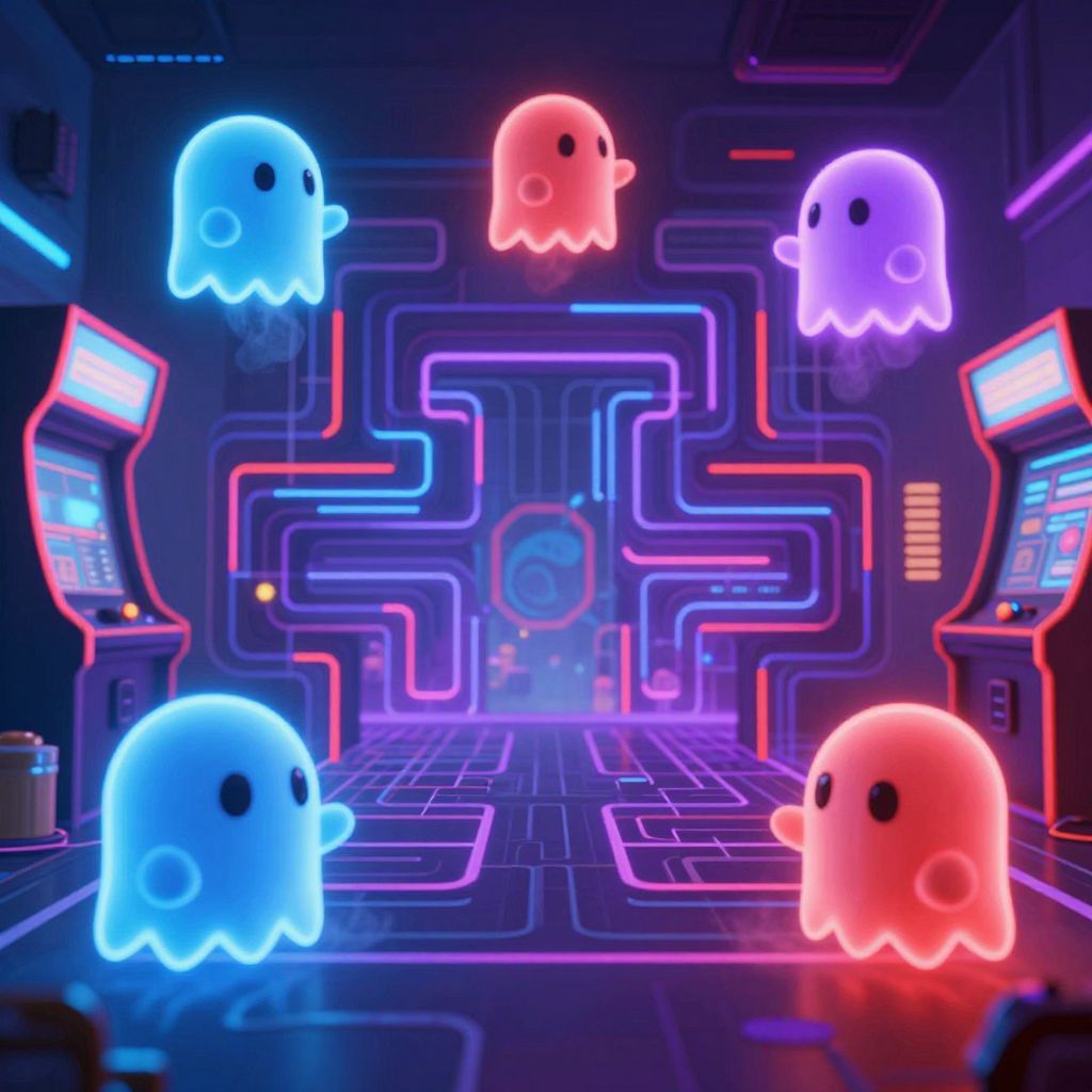 Neon-lit arcade room with glowing blue, red, and purple ghost-like creatures floating around retro arcade machines and neon-lit maze patterns. Digital