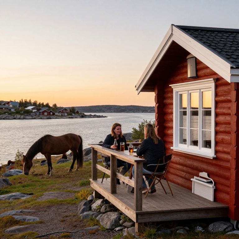 Mipmapping log cabin in the finnish archipelago near bromarv with two couples having beers on the terrace with horses eating outside in a beautifull sunset,