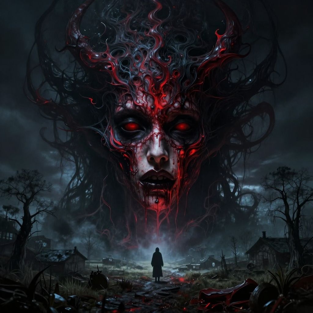 Digital illustration of a dark, monstrous face with glowing red eyes and twisted red-black tendrils, looming over a small, solitary figure in a foggy