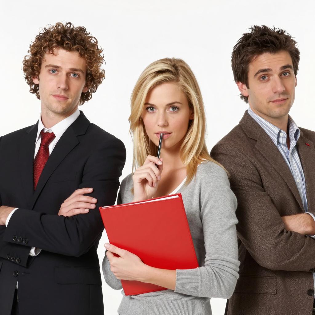 Three people in a photograph. Blonde woman in center with light skin, gray sweater, red folder, holding pen to mouth. Man on left with curly brown hair, light skin, black suit, red tie, arms crossed. Man on right with dark brown hair, light skin, brown suit, striped shirt, arms relaxed. White background.