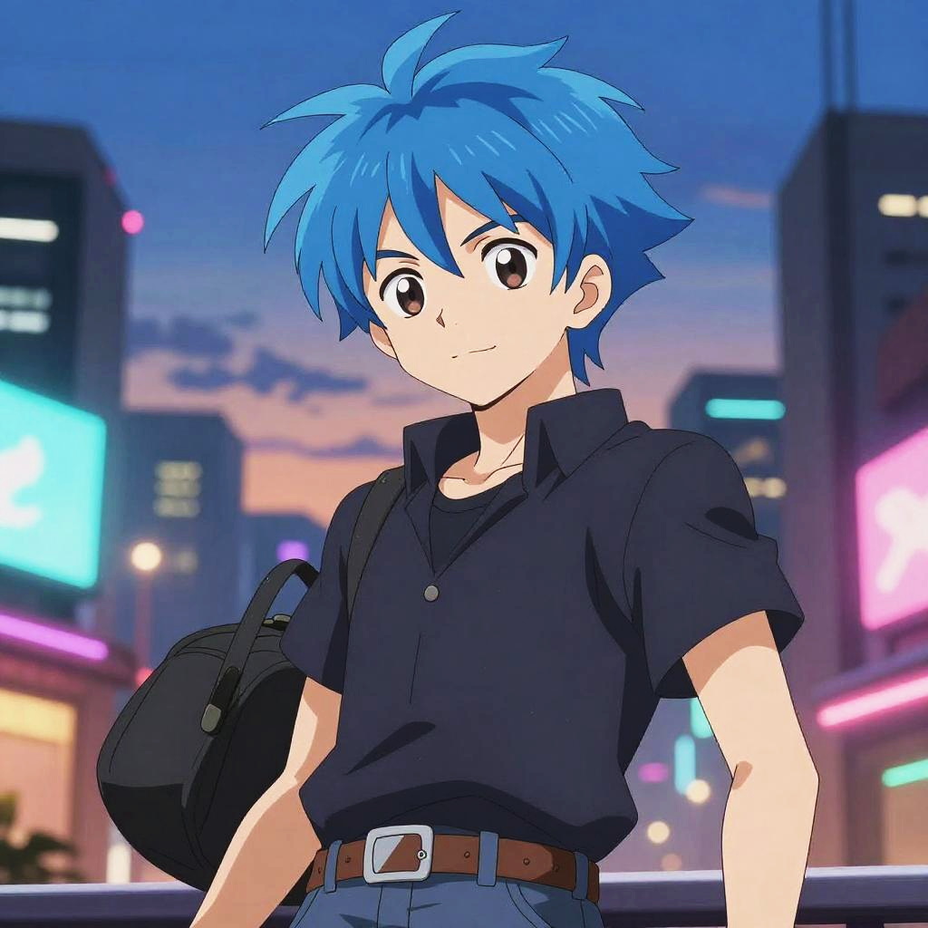 Animeboy with vibrant blue hair, standing in a futuristic cityscape at dusk, neon lights glowing, detailed anime style, dynamic pose, expressive eyes