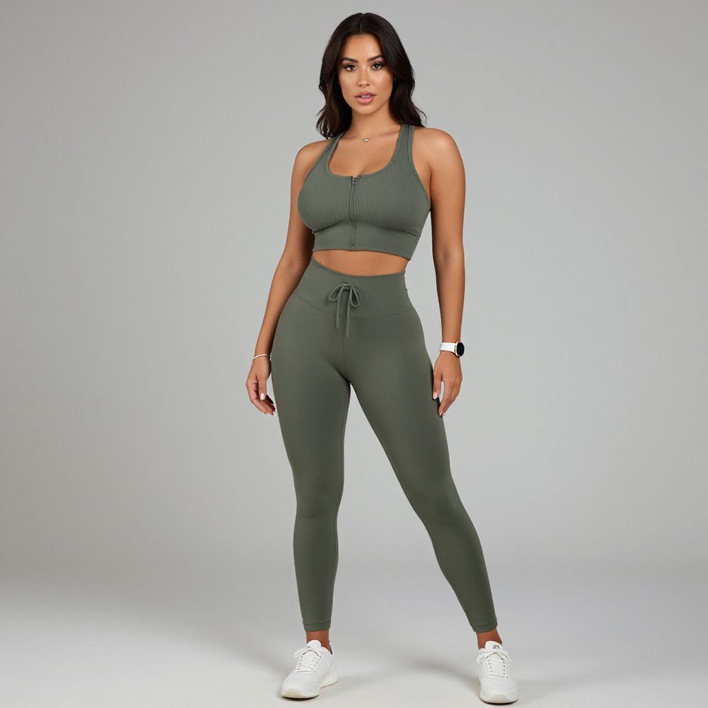 "Woman, athleisure, olive green ribbed crop top with front zipper detail, matching high-waisted leggings with drawstring, white sneakers, minimalist jewelry including a bracelet and a watch, studio background. Sexy. Pretty face and beаutiful eyes. Big breasts."