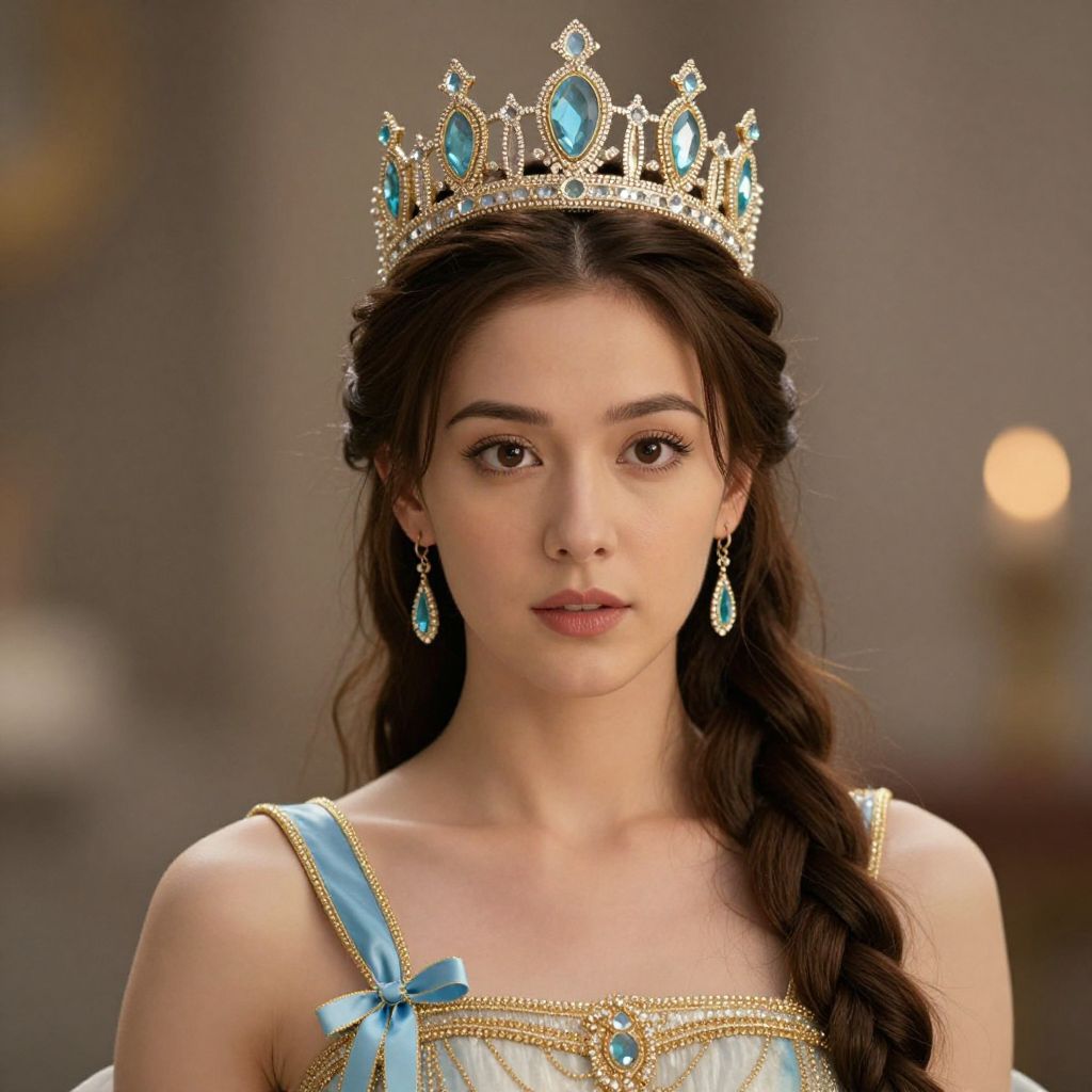 Photograph of a young woman with fair skin, long dark brown hair in a side braid, wearing a gold and turquoise jeweled crown, and matching turquoise teardrop earrings. She has large brown eyes, light pink lips, and a neutral expression. She wears an off-shoulder dress with light blue fabric and gold trim, adorned with a blue bow on the left shoulder. The blurred background hints at an elegant indoor setting with warm lighting. The overall style is regal and formal.