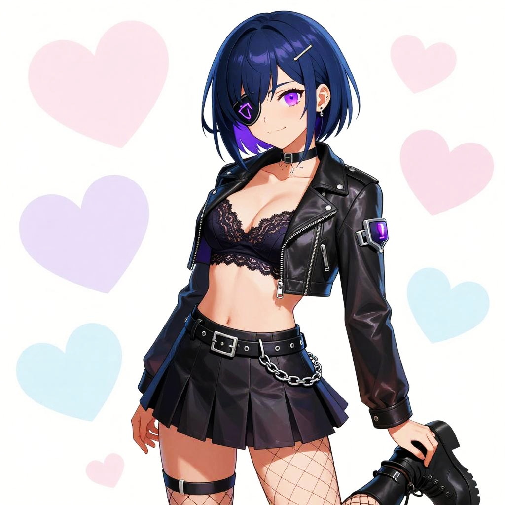 An anime style illustration of a confident young woman in her mid-20s with a short midnight-blue asymmetrical bob and a silver hairpin, big breasts, wearing a leather-accented cropped jacket over a lace bralette, high-waisted pleated skirt with a chained belt, thigh-high fishnet stockings and combat boots, and mechanical eyepatch with a soft violet rune glow on one side, silver ear cuff, and a small constellation tattoo behind her ear. She has visible eye bright violet with a sly smirk. The background is decorated with pastel hearts in shades of pink, lavender, and light blue. The artwork is colorful, vibrant, featuring soft shading and smooth line art, capturing a cute, friendly, and lively atmosphere.